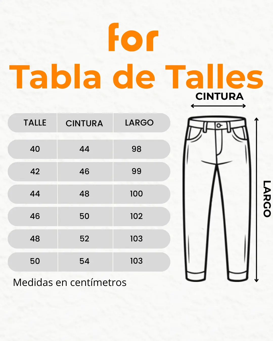 ¿Cómo medir?: Tome un jean que le quede bien y mídale la cintura y el largo de la misma manera que se muestra en la imagen. La cintura se mide solo de la parte del frente de la prenda, no todo alrededor. Si desea comparar la medida de la cintura del pantalón con la de su cintura, simplemente multiplique la primera por dos. El largo se mide de forma recta desde el lateral superior hasta la botamanga.